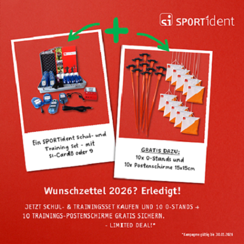 Beim Kauf eines SPORTident Schul- und Trainings Set (CHF 2560.00) erhälst du gratis 10 neue Trainingspostenständer mit Flagge. Die Aktion ist gültig für alle Bestellungen, die bis am 30. Januar 2026 per E-Mail eintreffen (andre_schnyder@hotmail.com). Achtung, das Trainingsset ist in 2 Ausführungen erhältlich: Variante A mit 30 SI-Card8 (CHF 2560.00) Variante B mit 30 SI-Card9 (CHF 2760.00) Bei der Bestellung bitte angeben ob Variante A oder B gewünscht wird.
